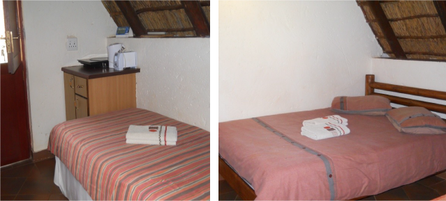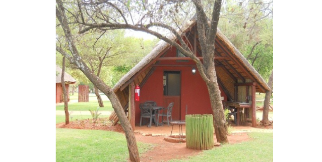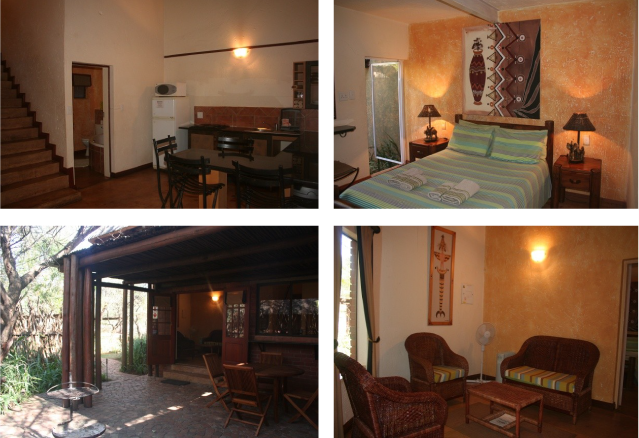 This 4 sleeper open plan unit with 1 double bed and single beds in one room, fireplace, TV (with some DSTV channels) makes this chalet more exclusive than the other 4 sleeper chalets. This unit is in the Main Camp and close to the Shop, Bar and cold & heated water swimming pools.