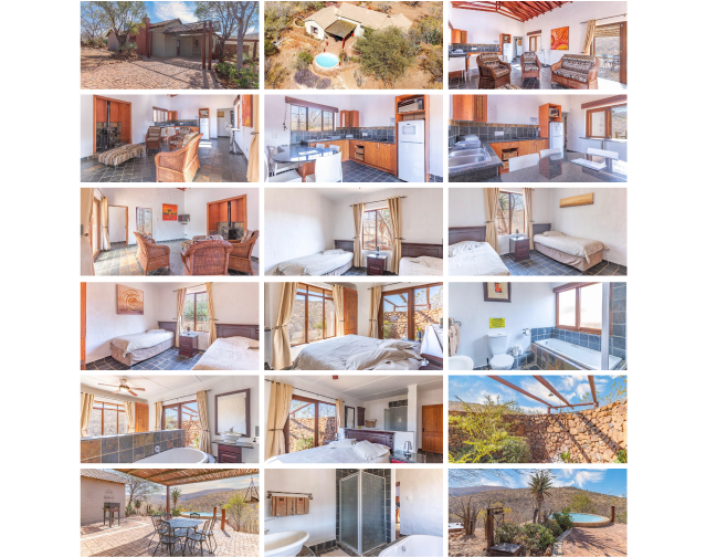 These units both have 3 bedrooms. The main bedroom is en suite with a private shower outside. The 2nd and 3rd bedroom both have 2 single beds. A second bathroom has a shower, bath, toilet and basin. You will also find an open plan kitchen / lounge with fireplace and TV (certain DSTV channels), 4-plate stove, microwave, kettle, fridge, cutlery and crockery. Outside a patio with braai facilities and splash pool.